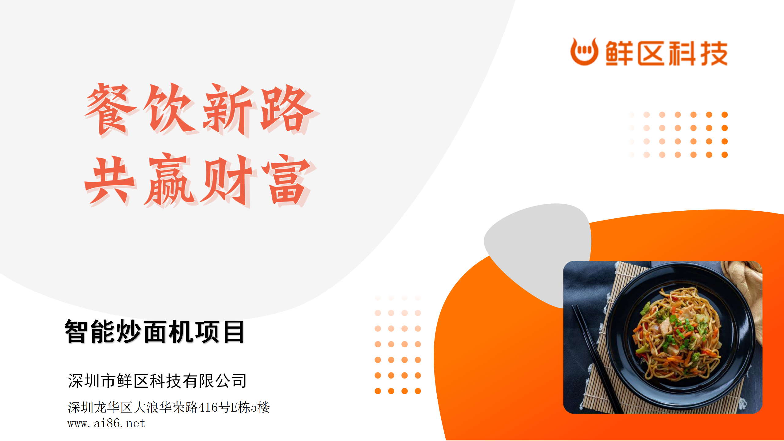 深圳市鲜区科技有限公司成立于2019,立志打造餐饮界里的智能化设备。鲜炒鲜区(现炒现吃),专业全自动智能机器为枢纽,打通上下游产业链,精 准把一份简单的饭和面,以人无我有独特优势,经由智能化无人自动化来实现,保证了产品的工艺标准化,产量规模化,复制无损化,保证食品卫生安全系数。在人工房租成本不断攀升的趋势下,以最有优势的价格推向市场,由无损复制乘以最大市场系数,获取最大商业利益,彻底改变当下餐饮业店面及人工成本高昴的局面,开拓餐饮新纪元。